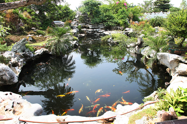 Thứ hai: chọn cách xây hồ chìm, tức hồ bằng với mặt đất và bên ngoài thành hồ sẽ dùng đá và cụm cây bụi để tạo thành hồ tự nhiên. Cách này tự nhiên hơn, cũng tiết kiệm được không gian hơn, chúng tạo được cảm giác hài hoà, không quá gò bó. Tuy nhiên, cách này cũng có nhiều bất cập, chính là việc uốn lượn của thành hồ bằng đá kè và cây bụi sẽ khiến khó khăn cho việc vệ sinh.