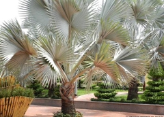 Lá cây Kè Mỹ mọc tập trung ở đỉnh, có hình quạt xòe rộng. Phiến lá tròn xẻ thùy đến một nửa hoặc xẻ thùy sâu vào phiến lá. Cuống lá dài mảnh, mọc vươn cao lên, khi già lá rũ xuống theo gốc. Cây có dạng lá cọ màu xanh tươi, khi già màu lá chuyển sang vàng rồi đến nâu và rụng khỏi cây. Cây Kè Mỹ có hoa dạng chùm lớn gồm nhiều nhánh. Hoa có màu trắng, lưỡng tính.