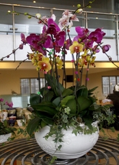 Chậu lan Hồ Điệp nhiều cành là sản phẩm hoa chậu Hồ Điệp lớn, đặc sắc. Sản phẩm sử dụng chậu sứ trắng lớn với họa tiết miệng lượn sóng để ghép nhiều cành lan Hồ Điệp tím và Hồ Điệp trắng thành hai tầng hoa đẹp mắt. Những cành lan được lựa chọn tỉ mỉ, chất lượng, hoa nhiều, cánh hoa lớn, màu sắc tươi thắm. Lá của các cành lan đều đều to bản, dài và có màu xanh đậm rất đẹp. Bên cạnh đó, cụm cỏ lan chi với những sọc trằng, xanh trồng đan xen với màu lá Hồ Điệp sẽ giúp cho chậu hoa thu hút hơn.